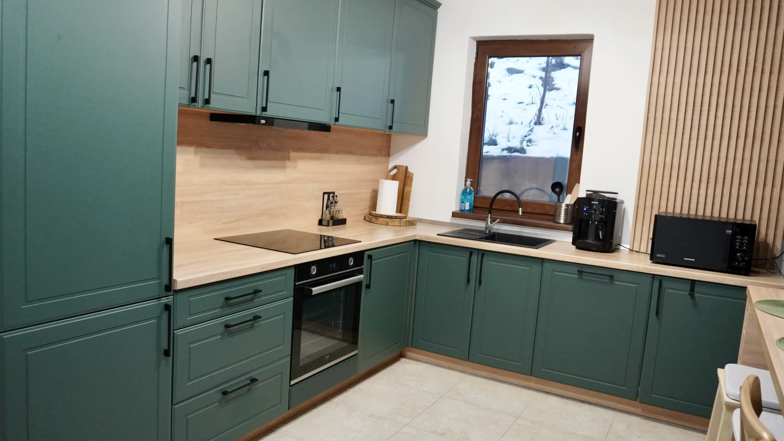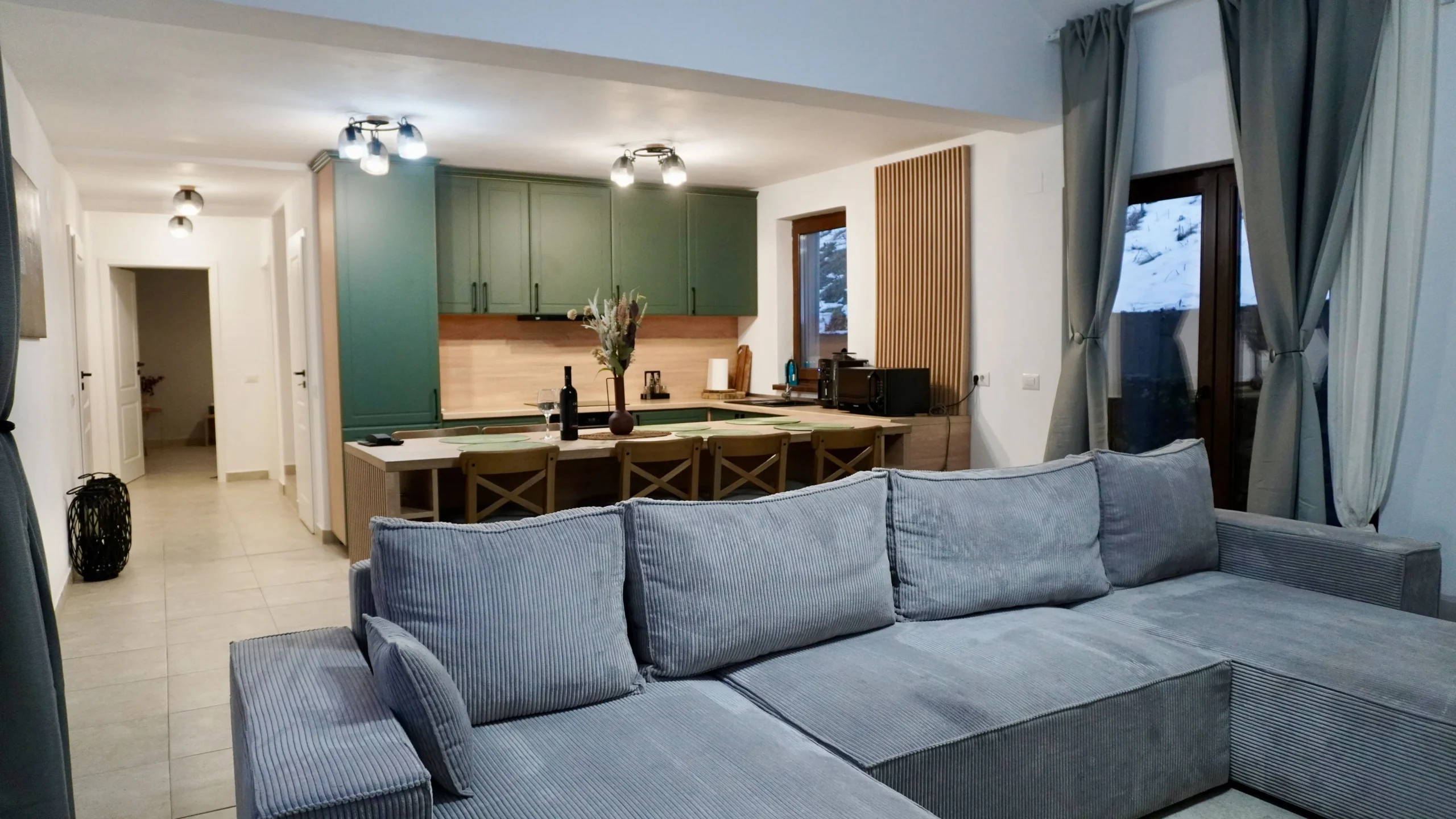 Bucătărie open space complet utilată, ideală pentru pregătirea meselor delicioase.