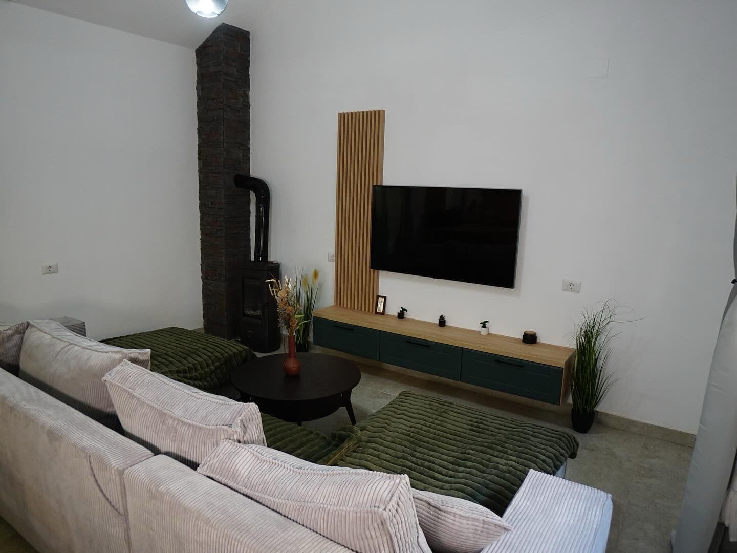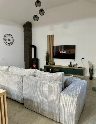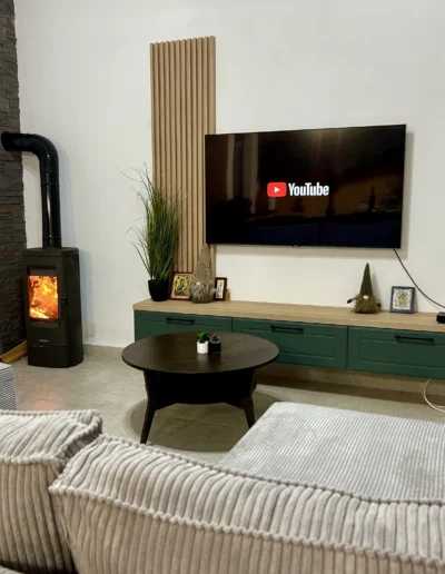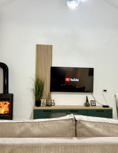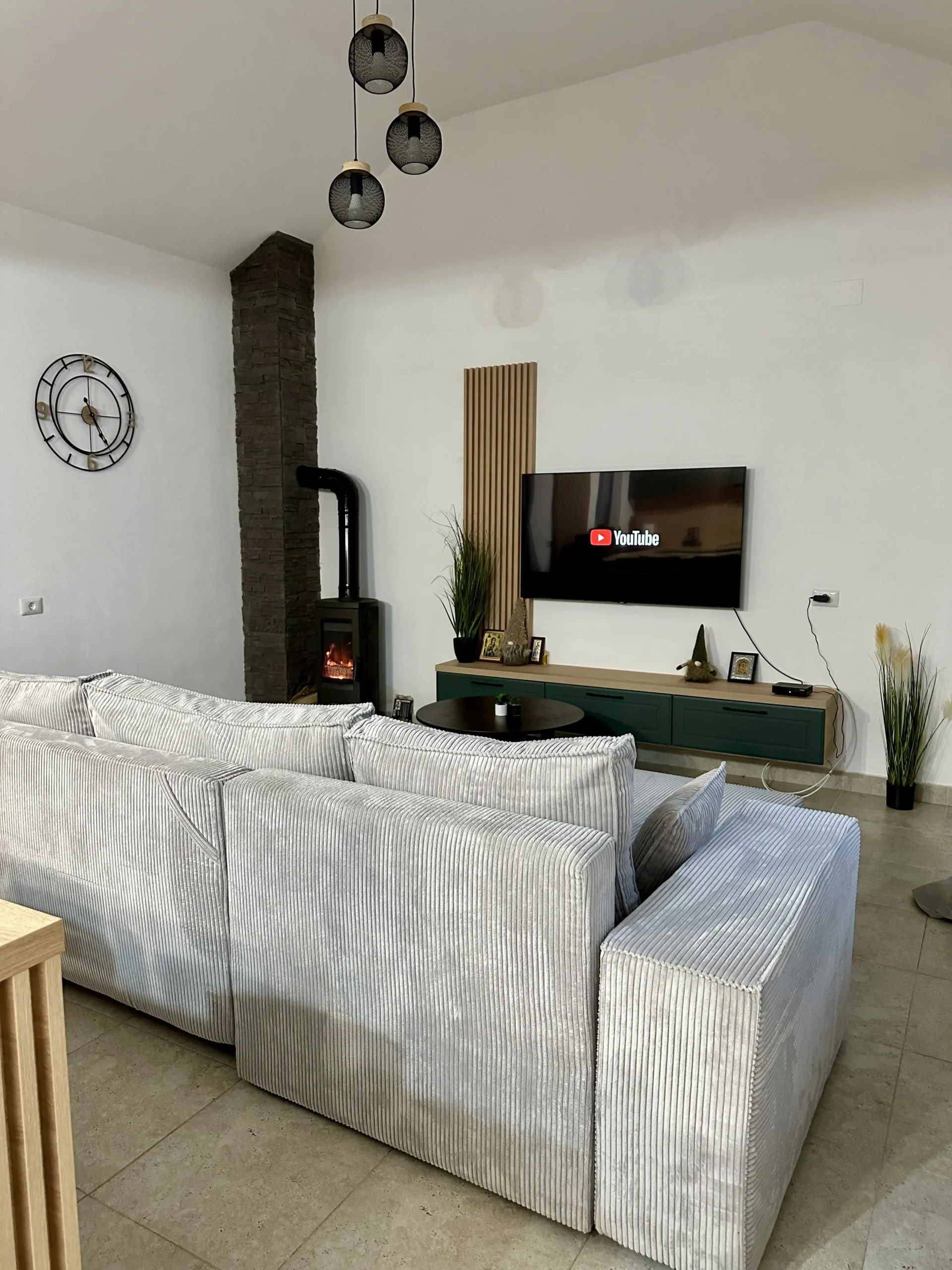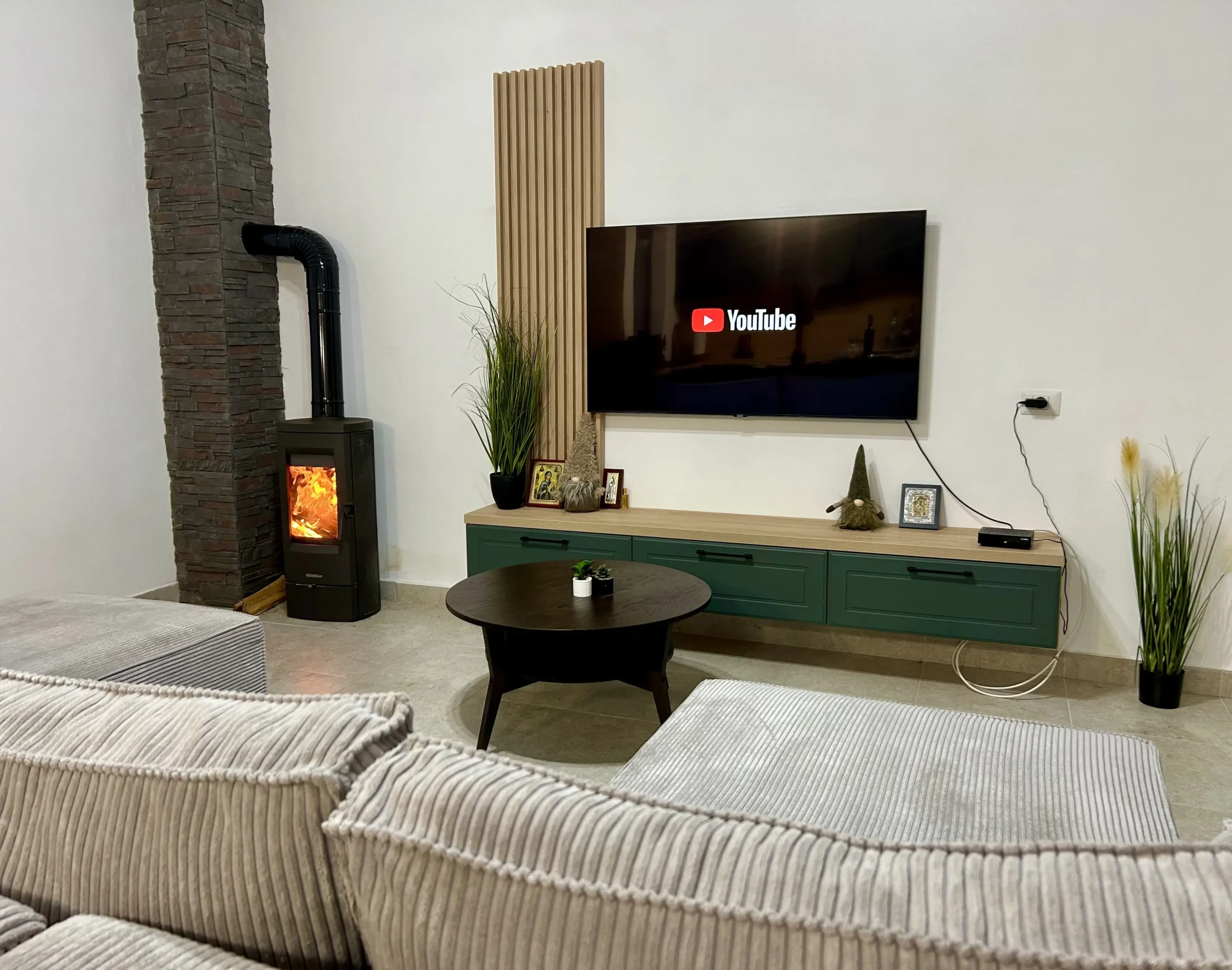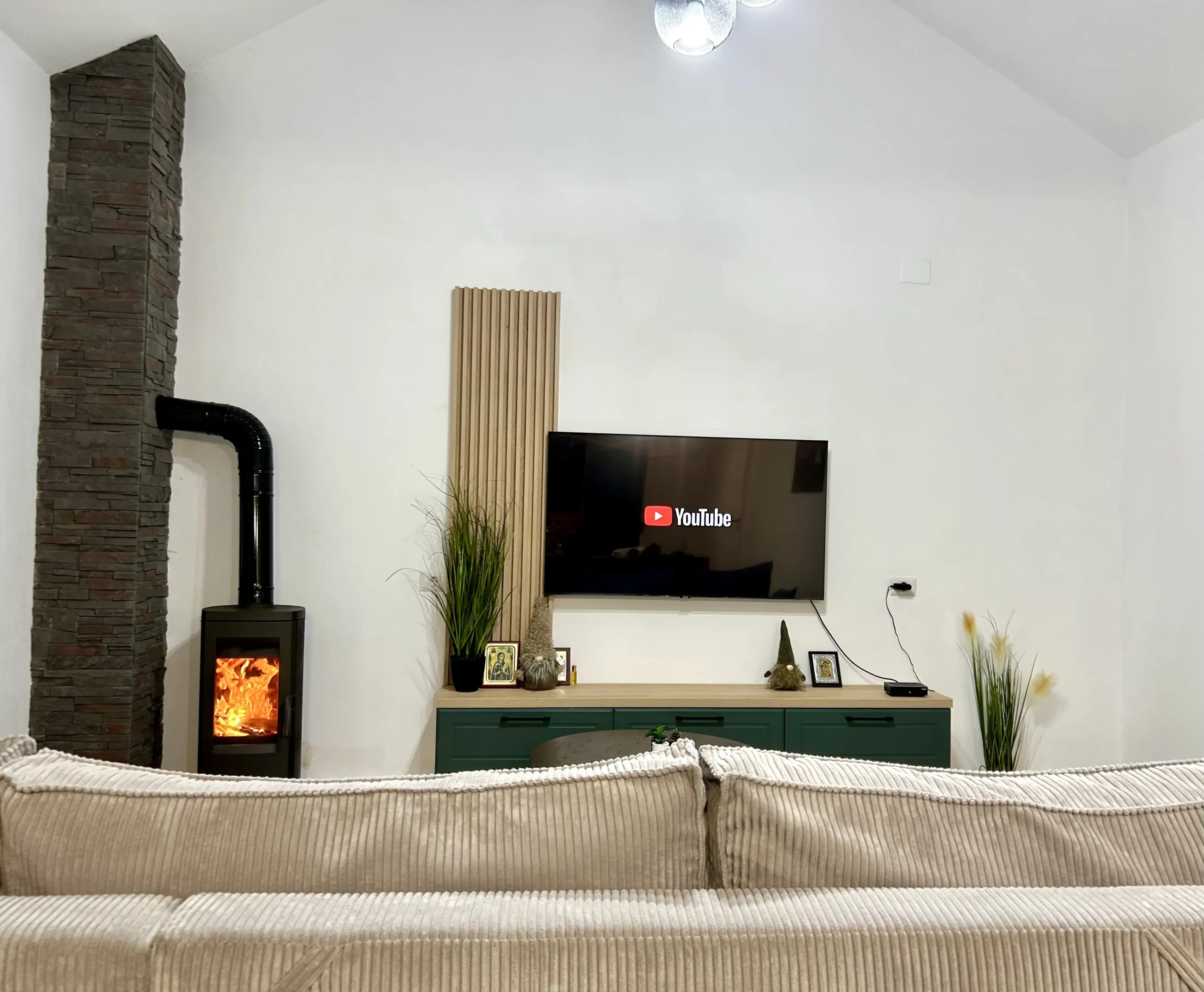 Livingul cu șemineu, canapea extensibilă și TV creează un spațiu modern, confortabil și ideal pentru relaxare.